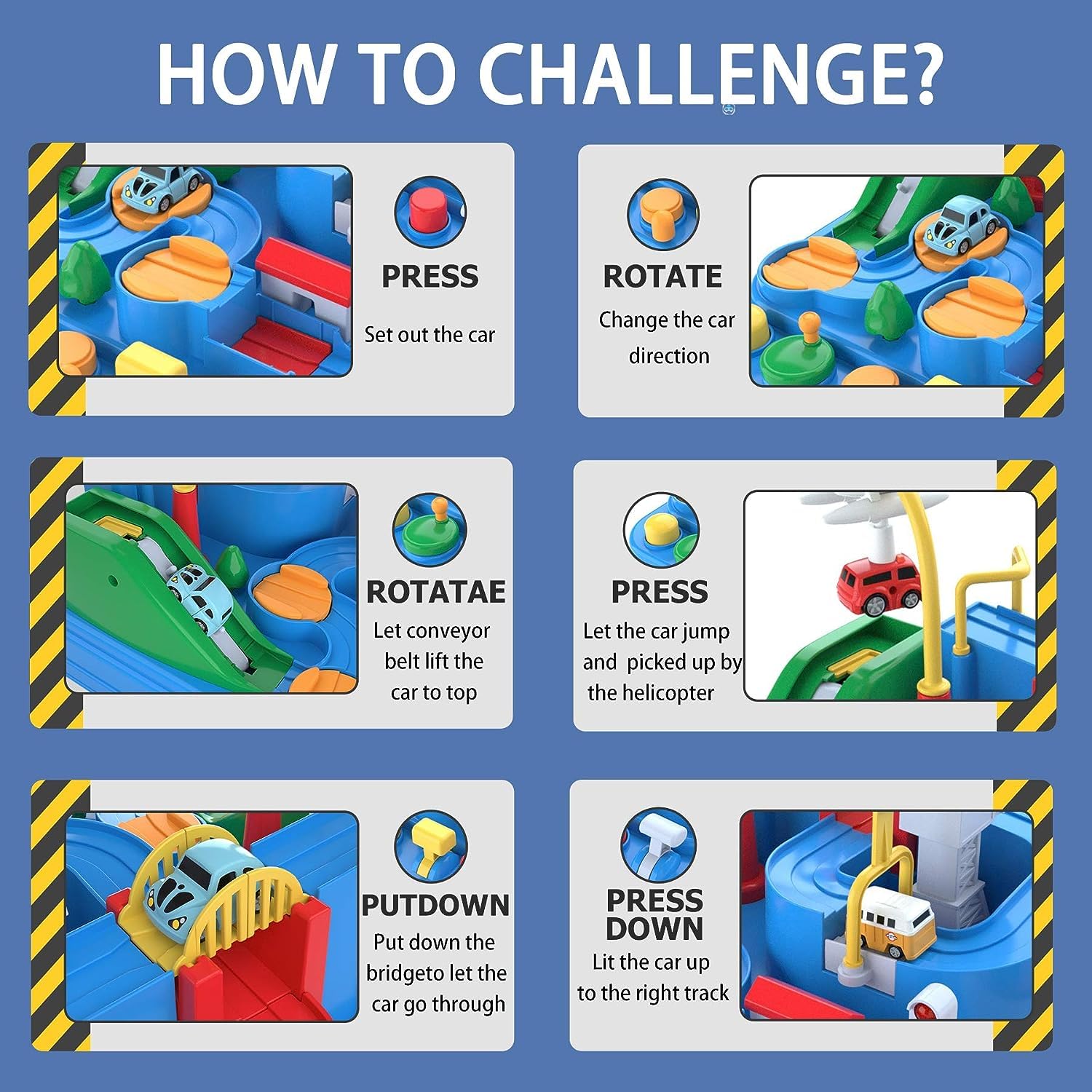 - 【Creative Design & Function】Unlike traditional track toys, kids don’t just watch; this Race Tracks has 2 toy trains(Police car and Family Car), 1 helicopter, 6 mechanical buttons and 8 challenges for kids to play together. The scientific mechanical physics architecture and the stable structure makes adventure track car toys more playable.