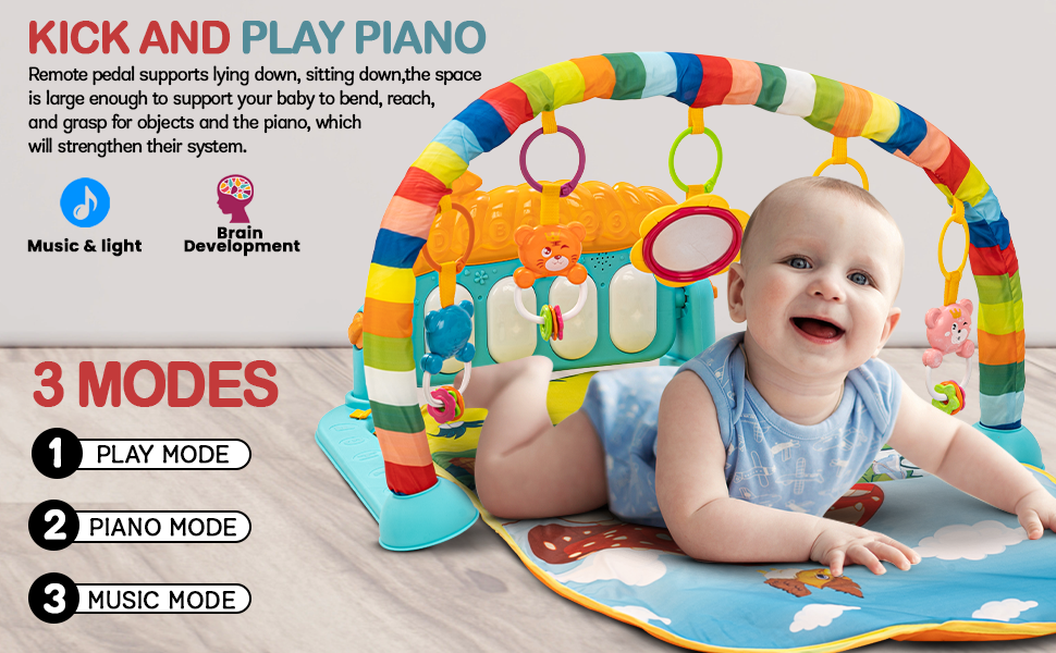 - Multi-function piano baby gym and fitness rack, Music rewards baby as he/she kicks the piano keys With movable musical piano keyboard can attach baby's attention and have fun. Five busy activity toys with a large mirror & 4 Animal Toys hangings included, This gym helps in stimulating baby's sensory touches like sight , tough and hearing Baby can sit /lie /play in the mat. Size : 45.7 x 34.4 x 8.4