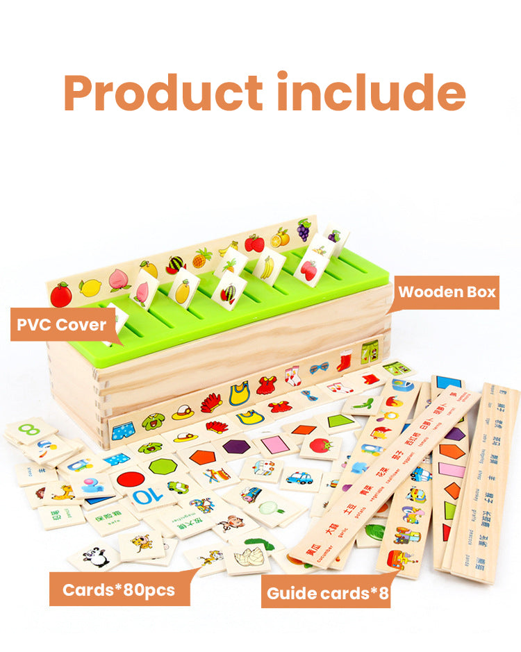 The classification box can develop the observation and analysis capabilities of young children. Exercise the comprehensive coordination ability of hands, eyes and brain. Products include fruits, vegetables, numbers, shapes, vehicles, household items, animals, clothing, and more.